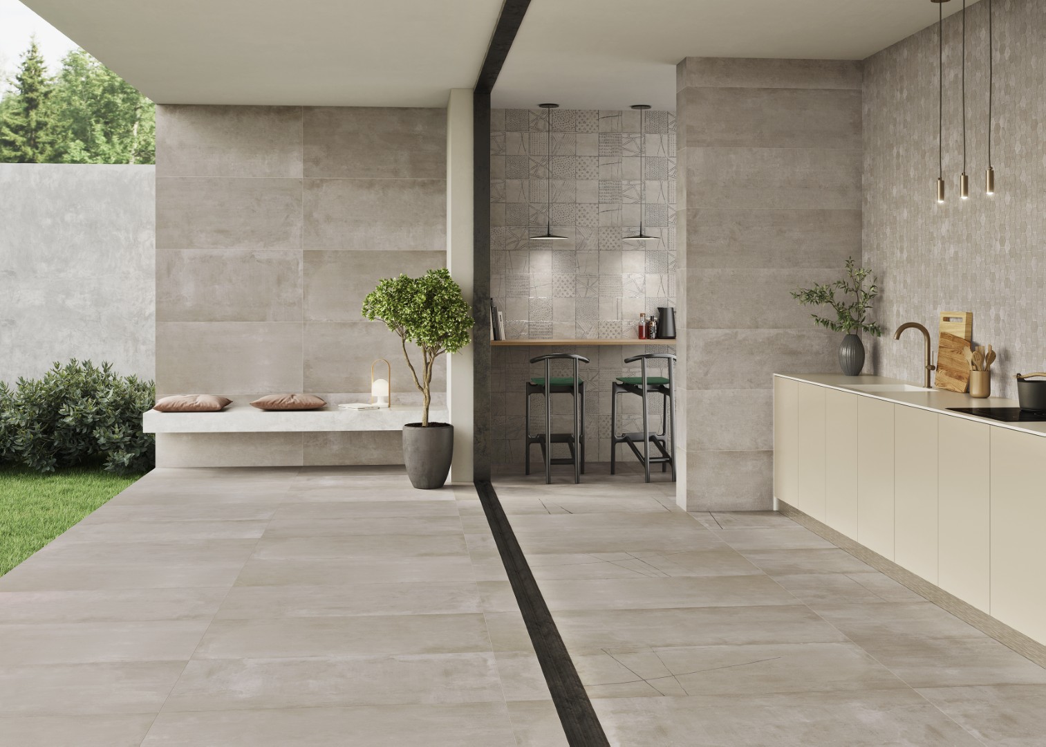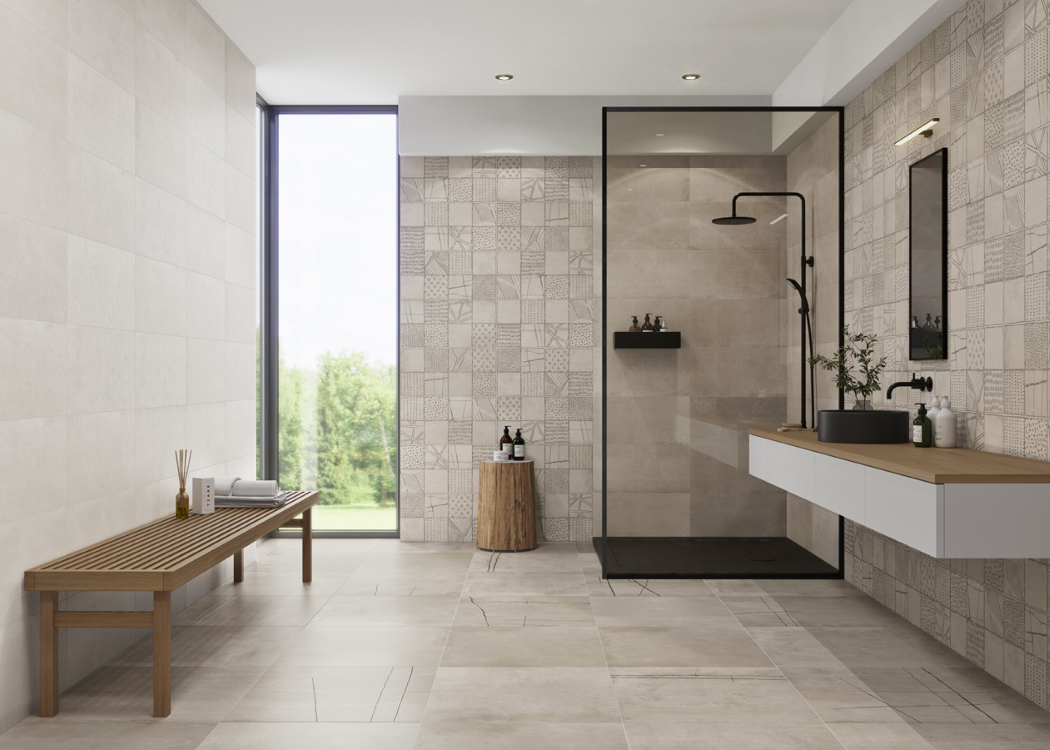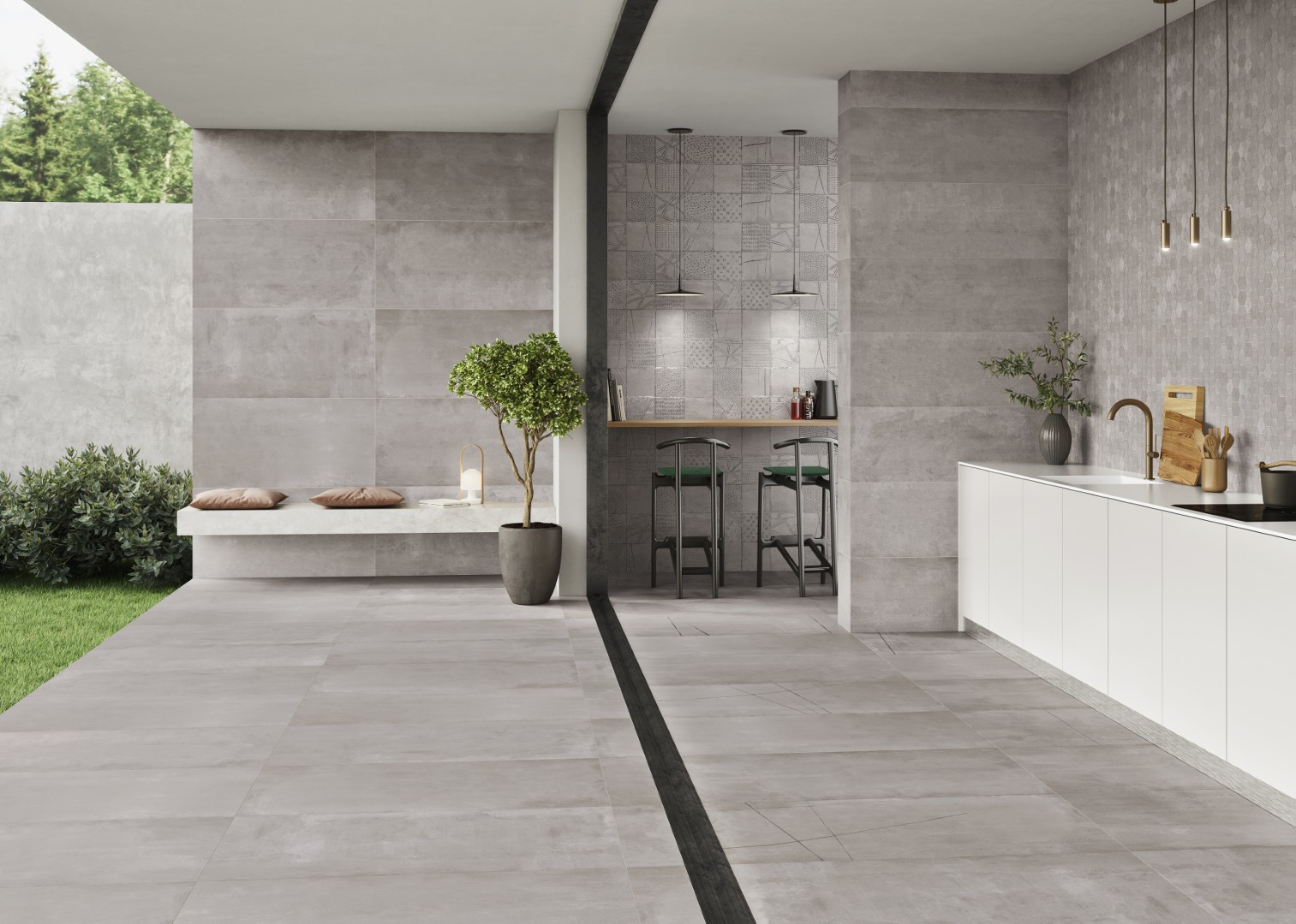 Along with a natural finish, it is also available with an anti-slip finish (C3) to provide continuity between interior and exterior spaces with the same material. For wall coverings in this format: 16″ x 48″.