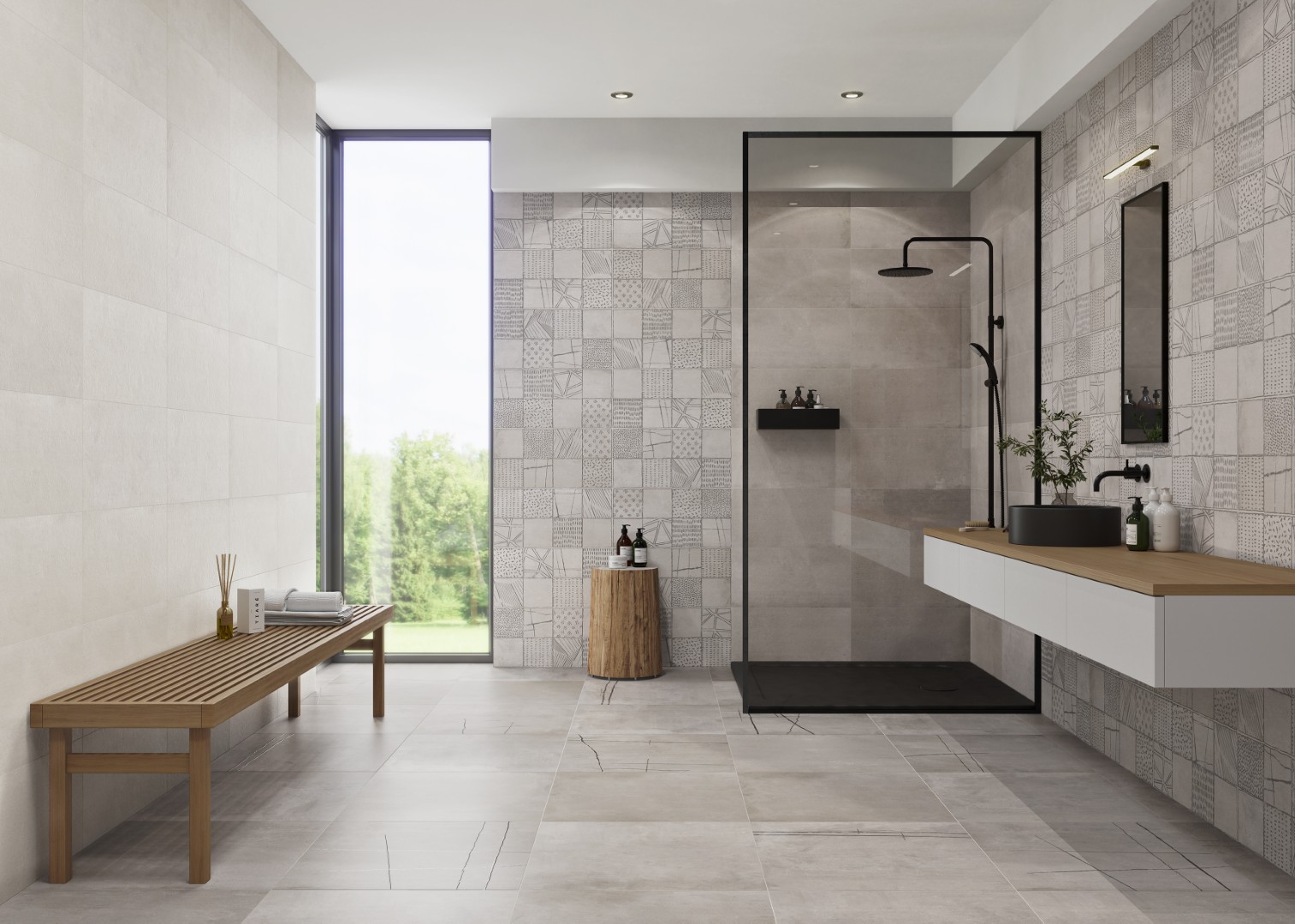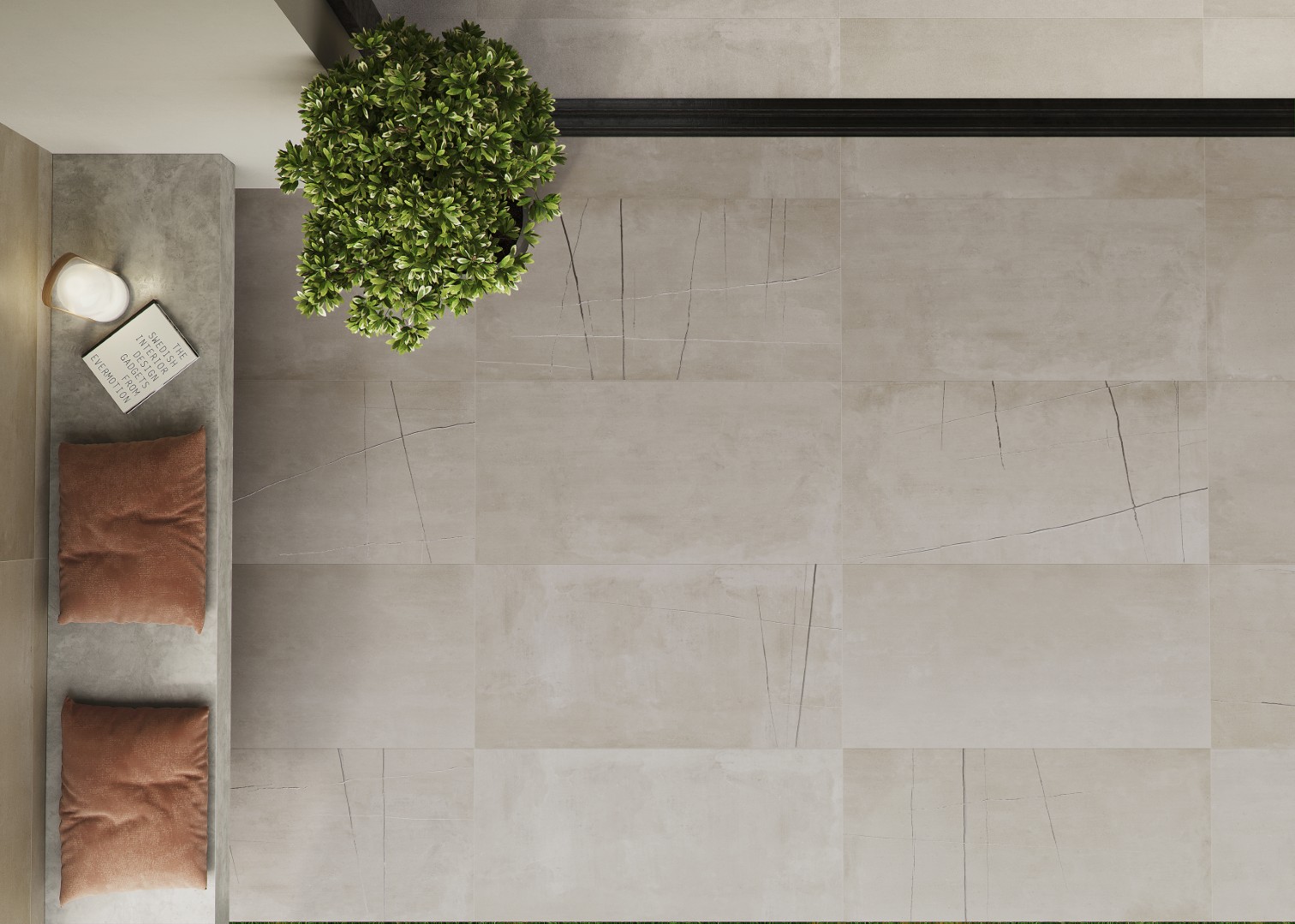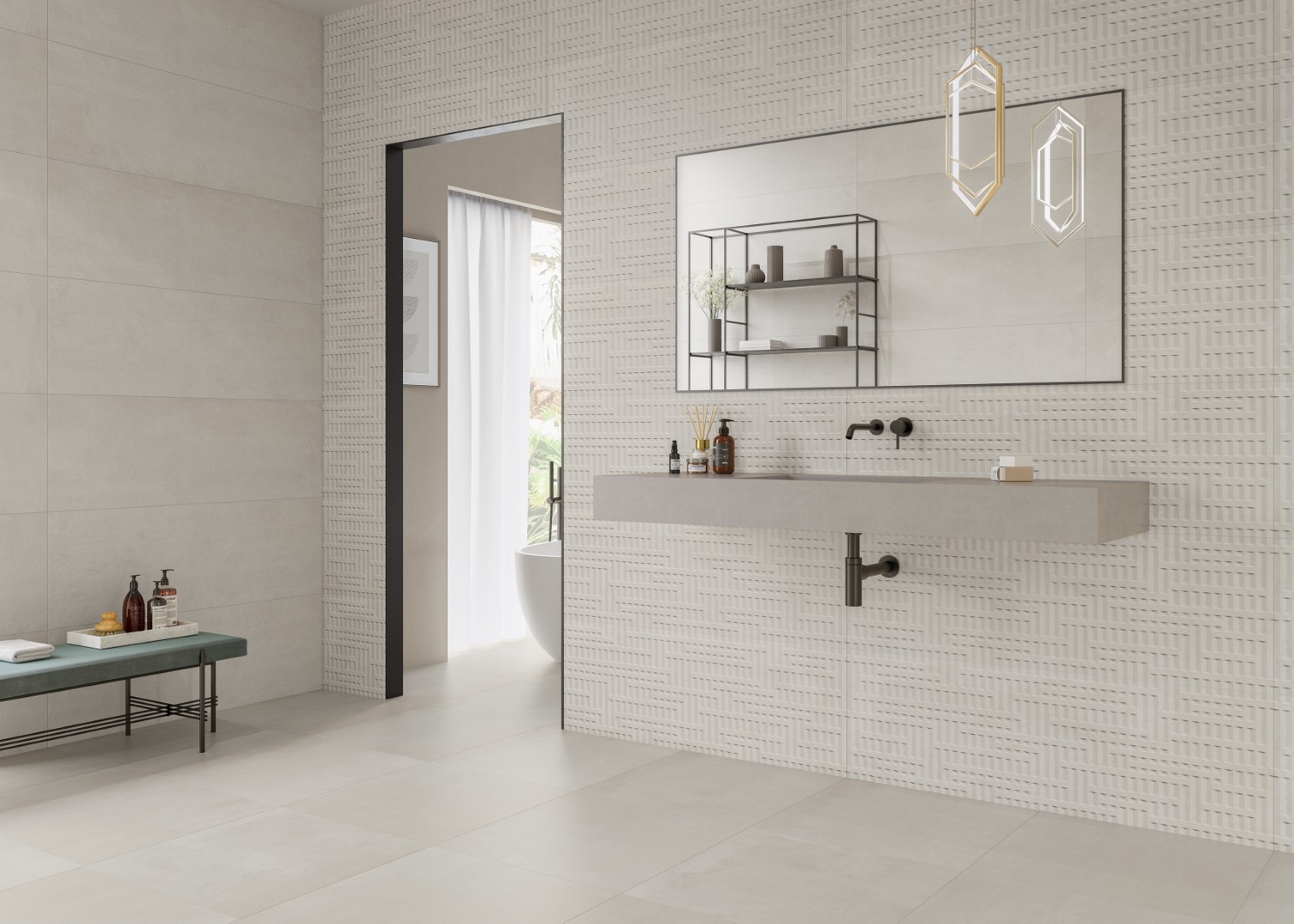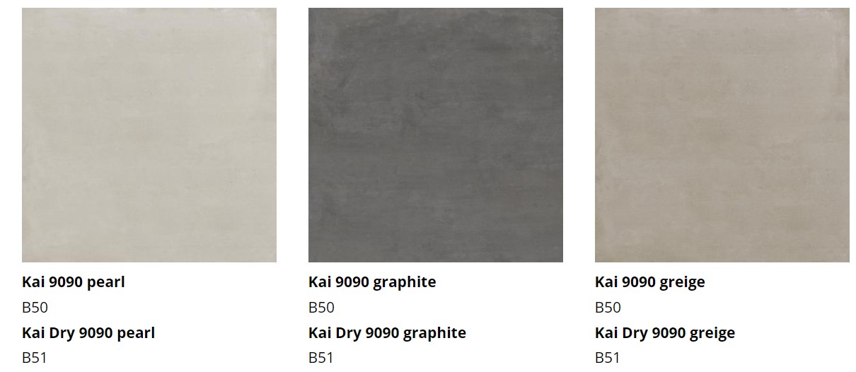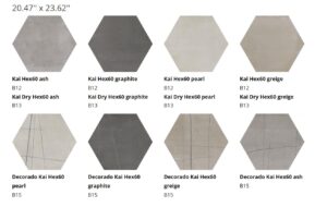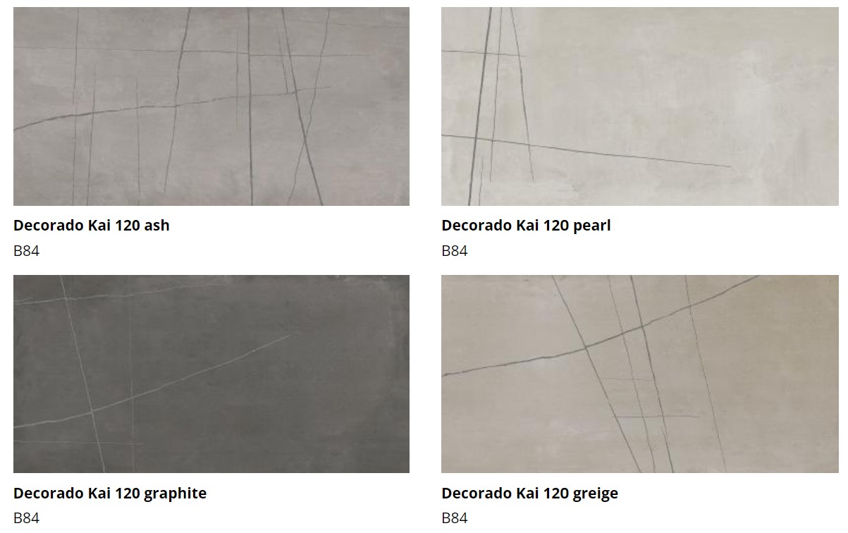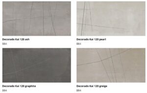 The KAI Collection is a fusion of natural, hand-worked cement and the veining of Sahara Noir marble. It is one of the most daring and ground-breaking designs that Kev Tiles is launching this year. It comes in four different colors, both with a smooth base and with the metallic-effect marble veining decoration, and it is available in 16″ x 48″.