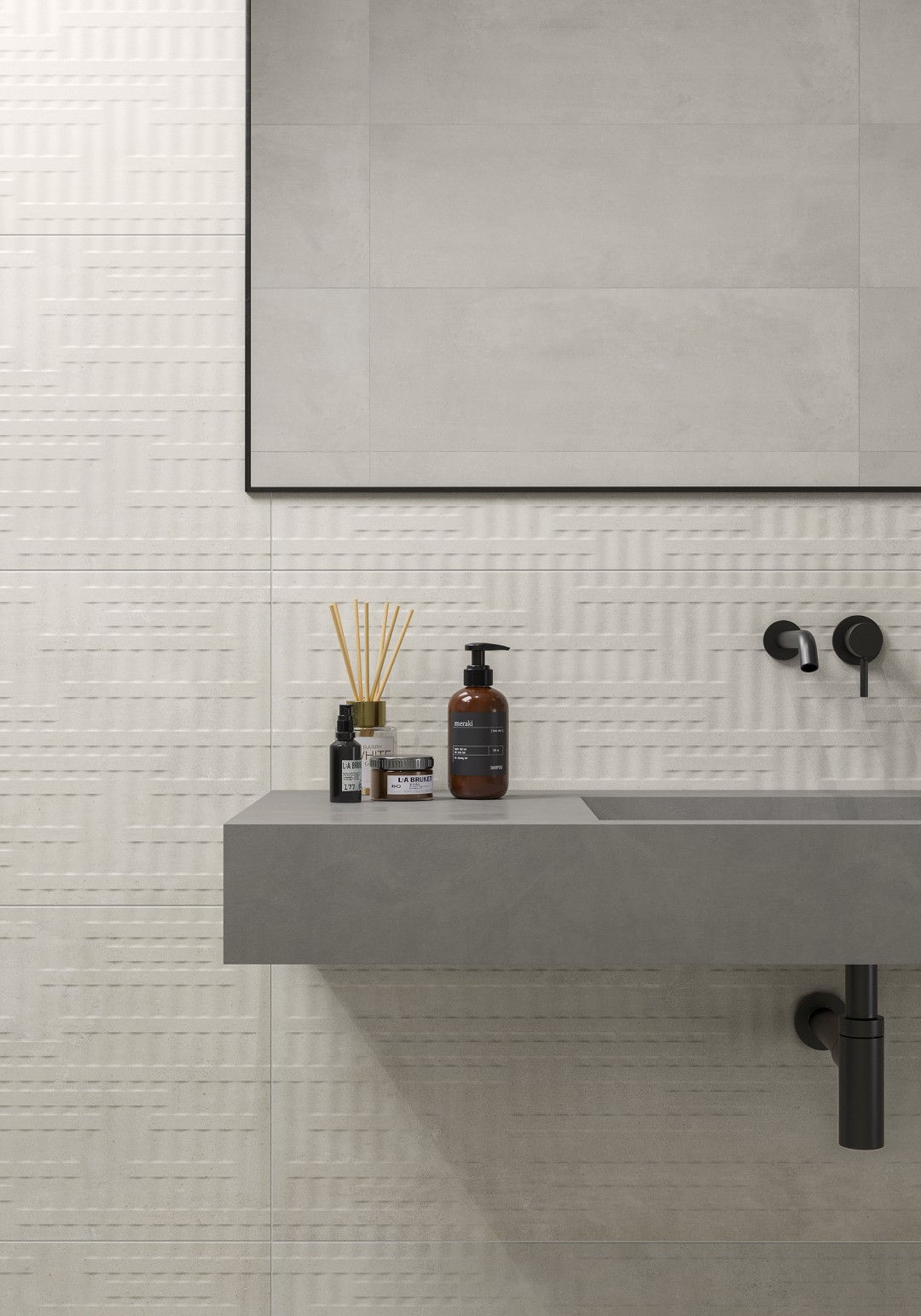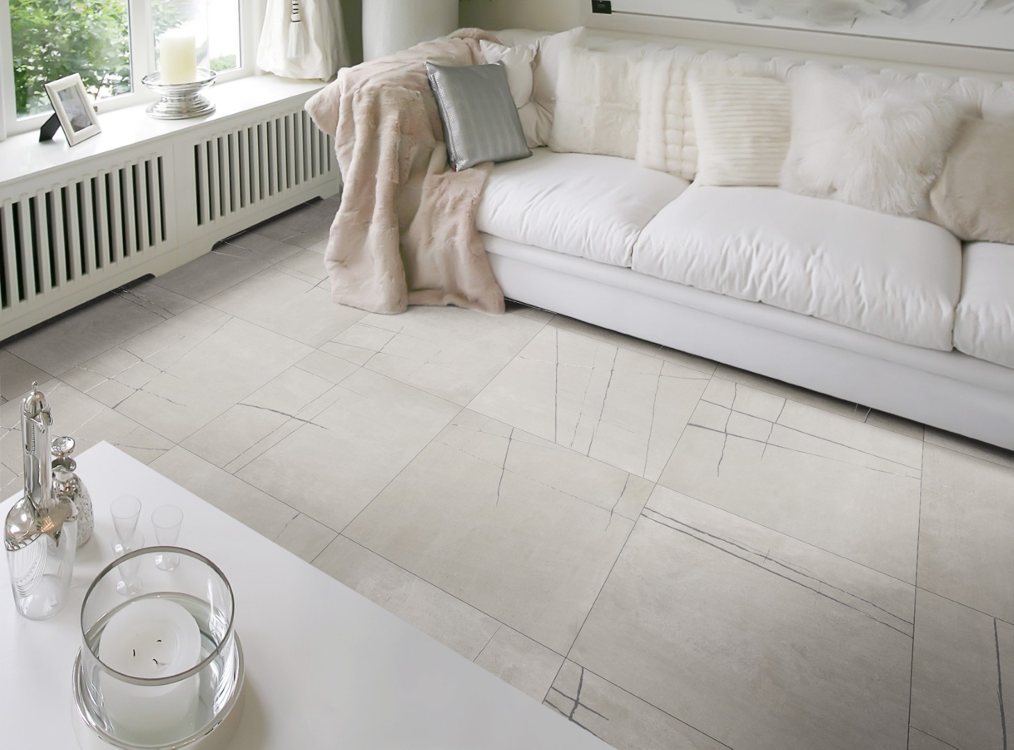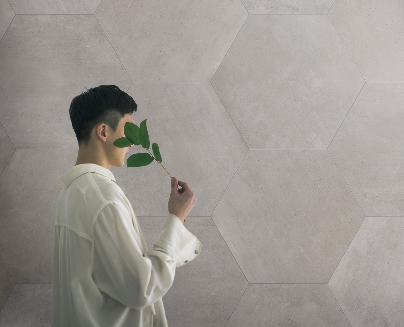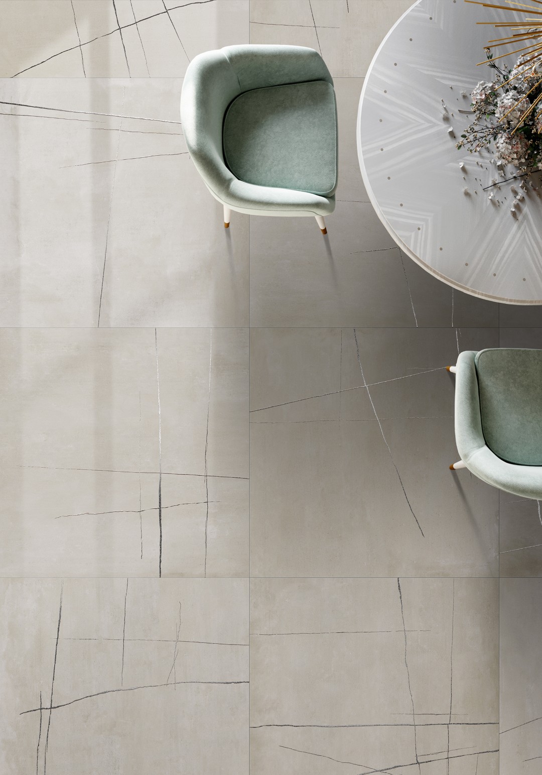 The KAI Collection is a fusion of natural, hand-worked cement and the veining of Sahara Noir marble. It is one of the most daring and ground-breaking designs that Kev Tiles is launching this year. It comes in four different colors, both with a smooth base and with the metallic-effect marble veining decoration, and it is available in 16″ x 48″.