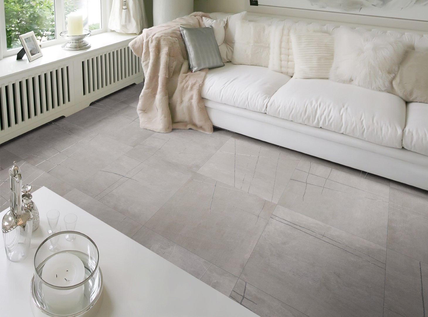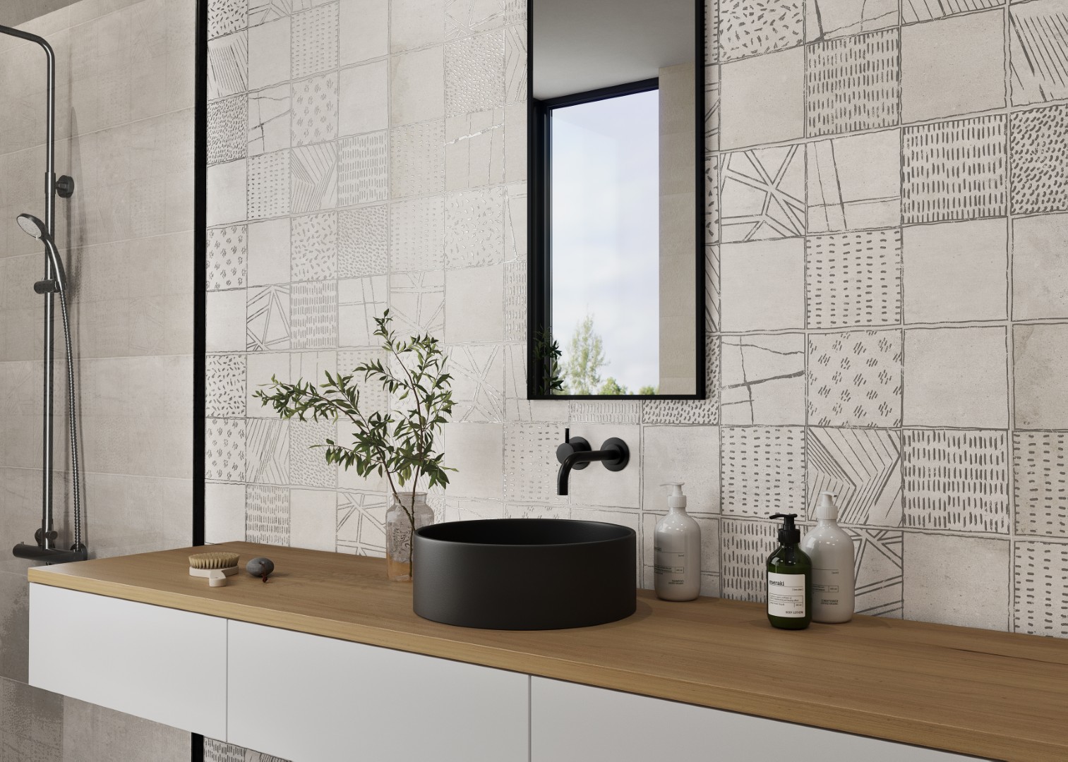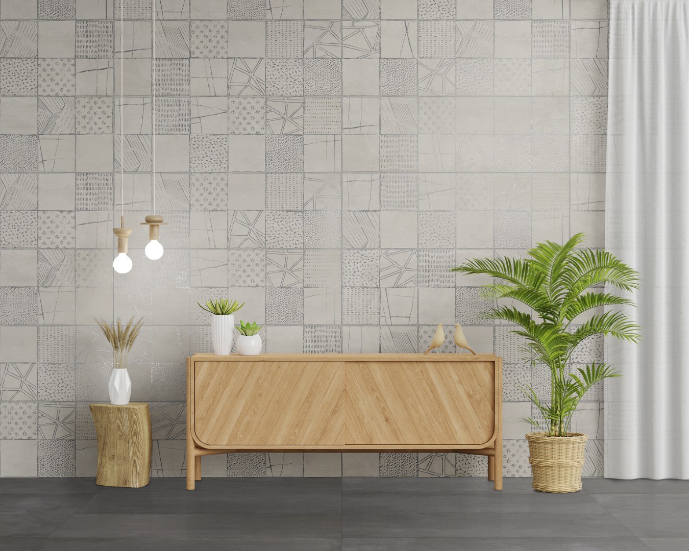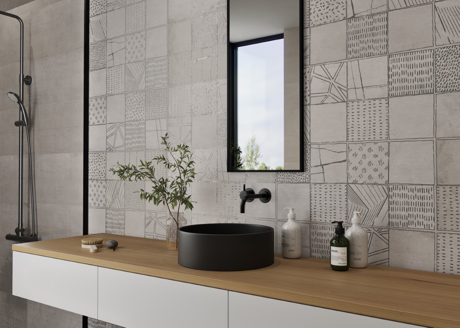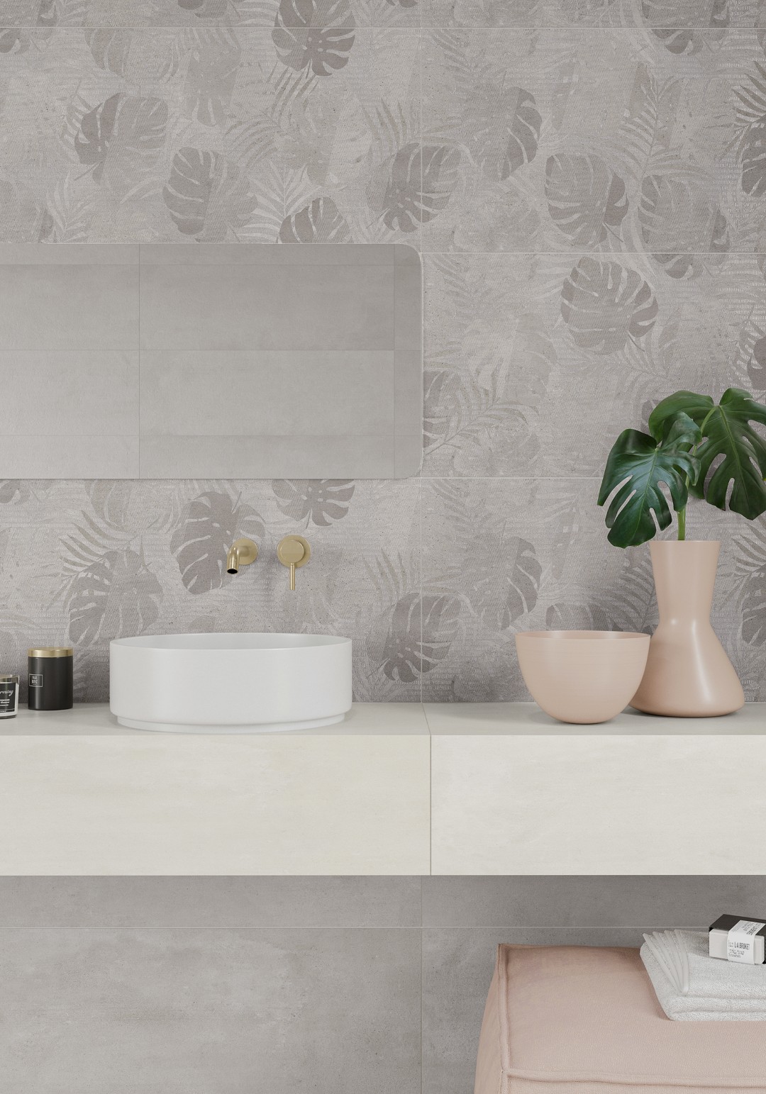 The KAI Collection is a fusion of natural, hand-worked cement and the veining of Sahara Noir marble. It is one of the most daring and ground-breaking designs that Kev Tiles is launching this year. It comes in four different colors, both with a smooth base and with the metallic-effect marble veining decoration, and it is available in 16″ x 48″.