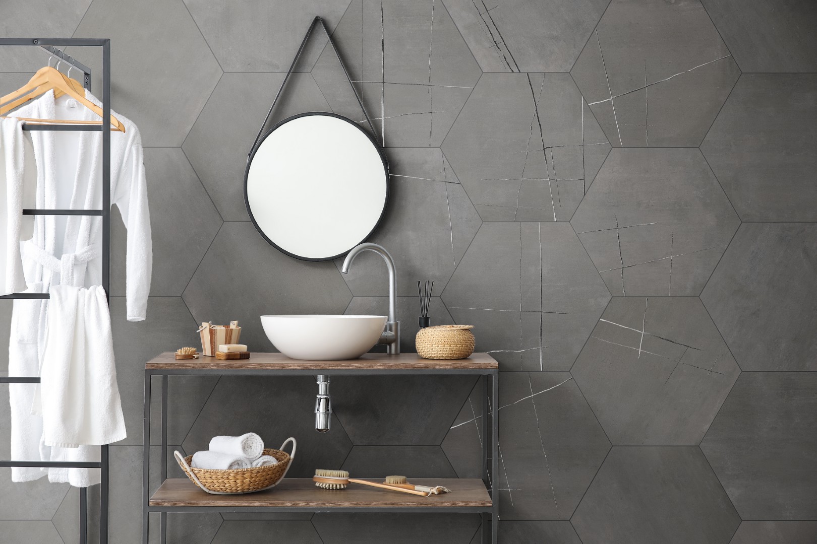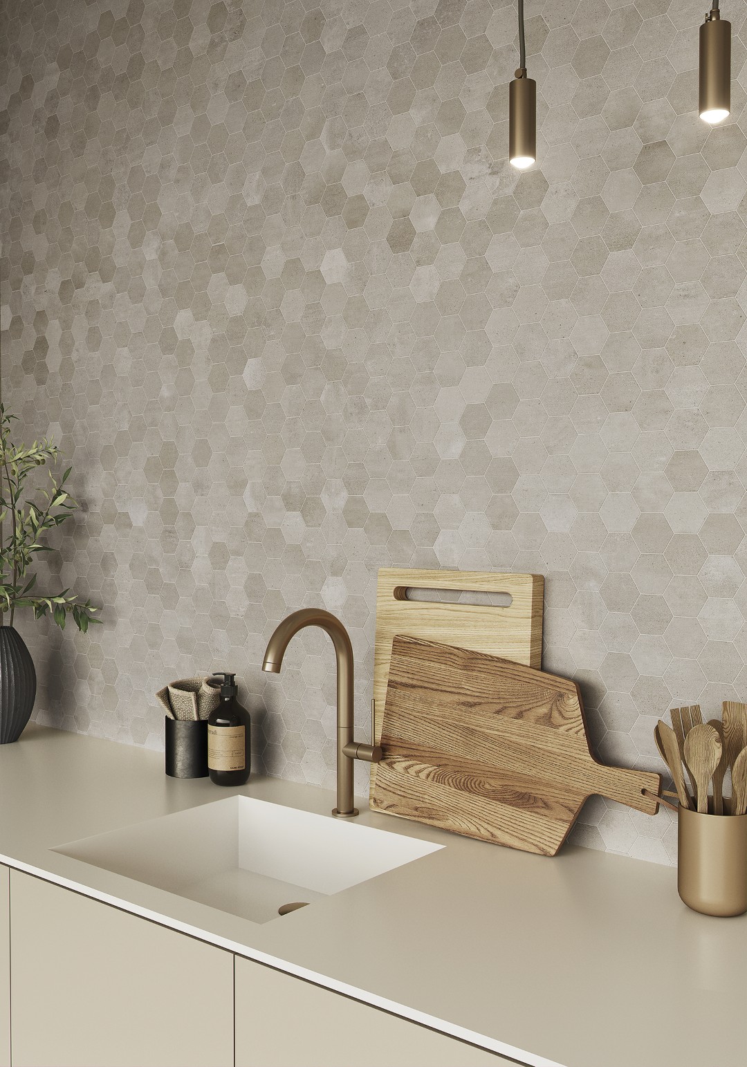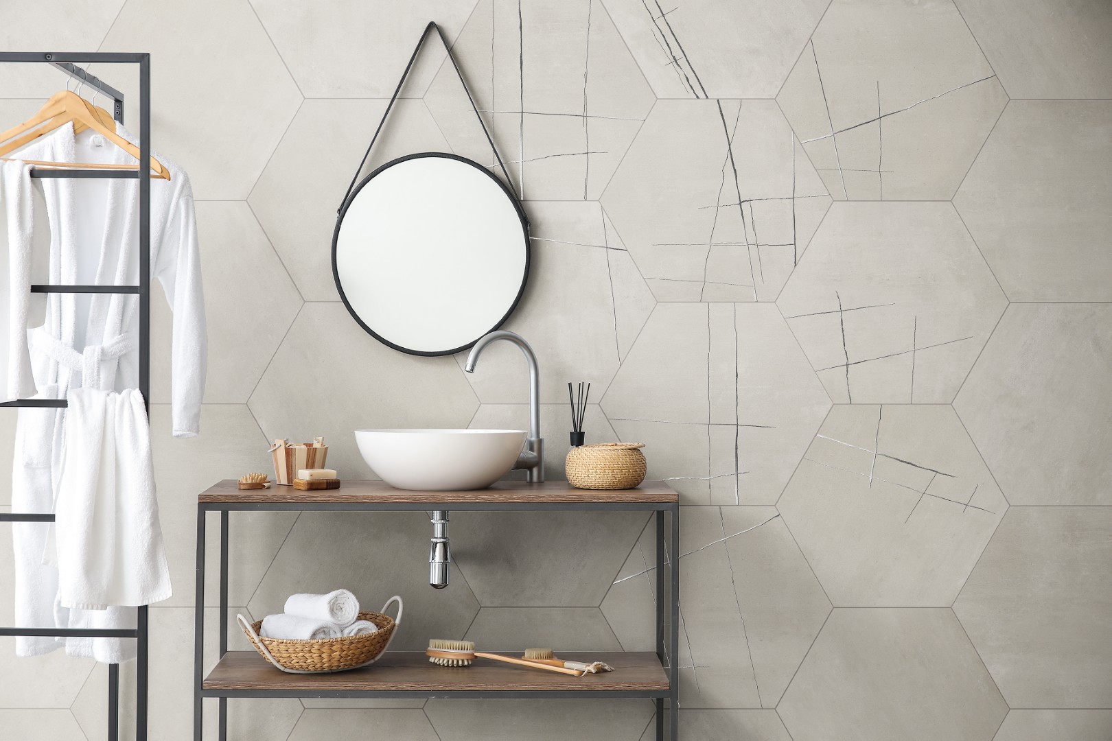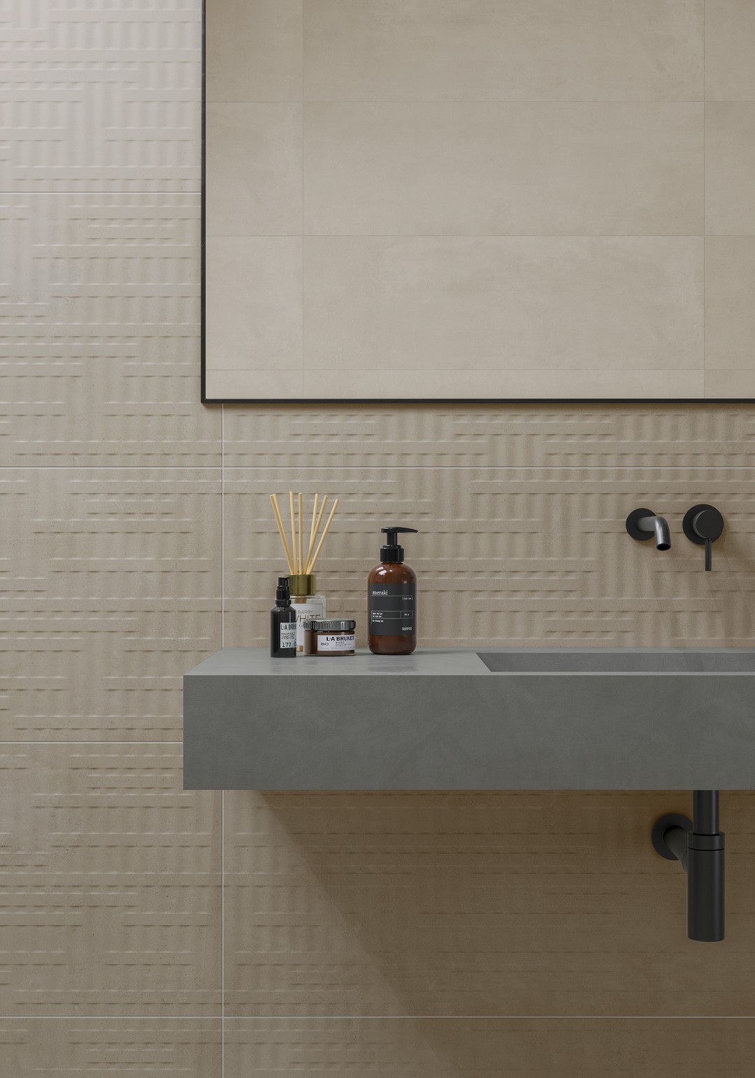 The KAI Collection is a fusion of natural, hand-worked cement and the veining of Sahara Noir marble. It is one of the most daring and ground-breaking designs that Kev Tiles is launching this year. It comes in four different colors, both with a smooth base and with the metallic-effect marble veining decoration, and it is available in 16″ x 48″.